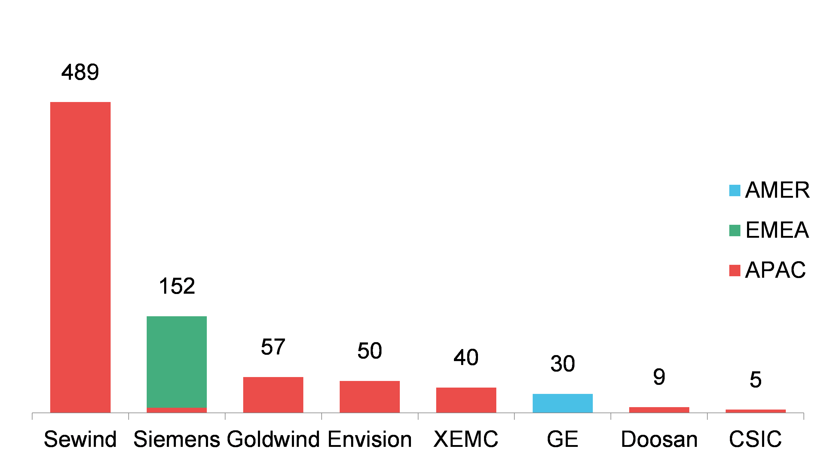 La filière de l’éolien en mer (offshore) ne représente que 832 MW sur les près de 53 000 MW éoliens installés en 2016. Mais le secteur a bénéficié d’un soutien des Pouvoirs Publics notamment en France avec l’organisation d’appel d’offres pour la construction de parcs éoliens en mer (Tréport, Fécamp, St Brieuc notamment). L’Allemagne ou le Royaume-Uni ont déjà des installations offshore en fonctionnement. Pour autant, Selon le classement BNEF, c’est le Chinois Sewind qui arriverait numéro un avec 489 MW installés. Des chiffres qui s’expliquent par le fait que les turbines fabriquées par la compagnie chinoise sont en fait sous licence Siemens, le leader européen historique de l’offshore. Sur les 489 MW, seuls 101 MW étant vraiment des machines de conception chinoise.