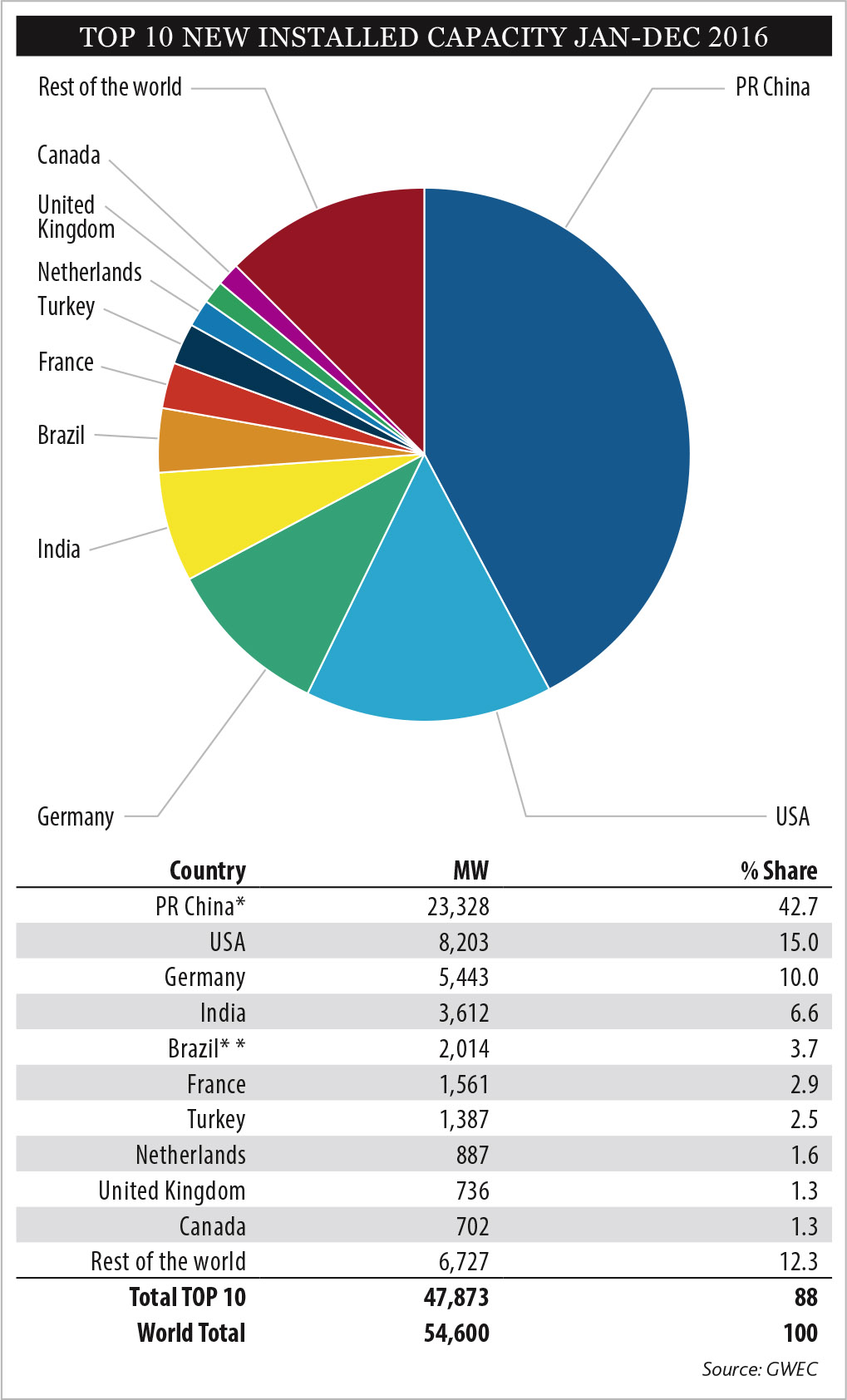 Le dynamisme du marché asiatique de l’éolien est largement lié à deux pays : la Chine et l’Inde qui représentent à eux deux la moitié du marché mondial (49,3%). Selon le Global Wind Energy Council (GWEC), la Chine aurait à elle seule connectée 23 GW éoliens, un chiffre impressionnant bien qu’en-deçà du record absolu de 2015 (30 GW en une année). Le ralentissement du marché chinois est lié à une demande électrique moins forte qu’anticipée et une baisse des aides aux renouvelables.
