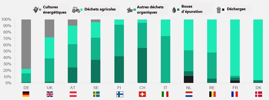 Les ressources utilisées pour la méthanisation sont, par ordre d’importance, les déchets agricoles, les cultures énergétiques, les autres déchets organiques et les boues d’épuration. Si les cultures énergétiques ont été très tôt développées par l’Allemagne et ont longtemps été majoritaires, elles stagnent depuis 2016, tandis que le recours aux déchets agricoles a fortement augmenté, porté par la priorité que la France leur donne. Ils sont désormais en tête, mais les mélanges sont encore très divers selon les pays (voir graphe ci-dessous).