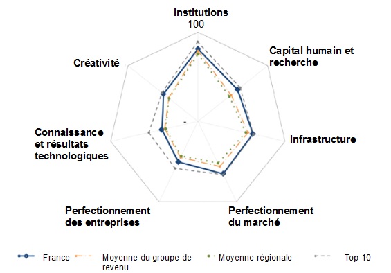 La France se retrouve dans le top 25 pour tous les domaines pris en compte par l’indicateur et est mieux classée que la moyenne européenne. Sa force s’observe notamment dans trois domaines : le capital humain et la recherche (11e), l’infrastructure (10e) et le perfectionnement du marché (11e). En particulier, la France est première pour l’indicateur des opérations de capital-risque, deuxième pour la performance environnementale et quatrième pour la qualité de ses publications scientifiques. Par ailleurs, la région parisienne occupe la 9e place du classement des pôles mondiaux les plus innovants.