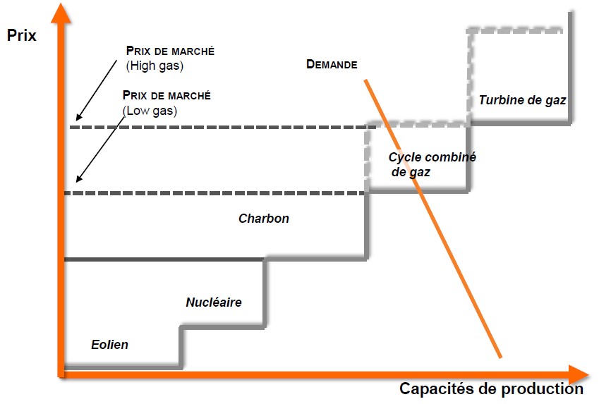 Le graphique qui illustre l’ordre d’appel des moyens de production n’est qu’en partie lié aux coûts. En effet les moyens éoliens et solaires sont à injecter dès qu’ils produisent dans le respect de la loi européenne (code de l’énergie il me semble). Et même s’ils sont plus chers que les autres moyens à disposition (hydraulique, nucléaire), ce qui est encore aujourd’hui le cas pour la majorité des moyens en place.