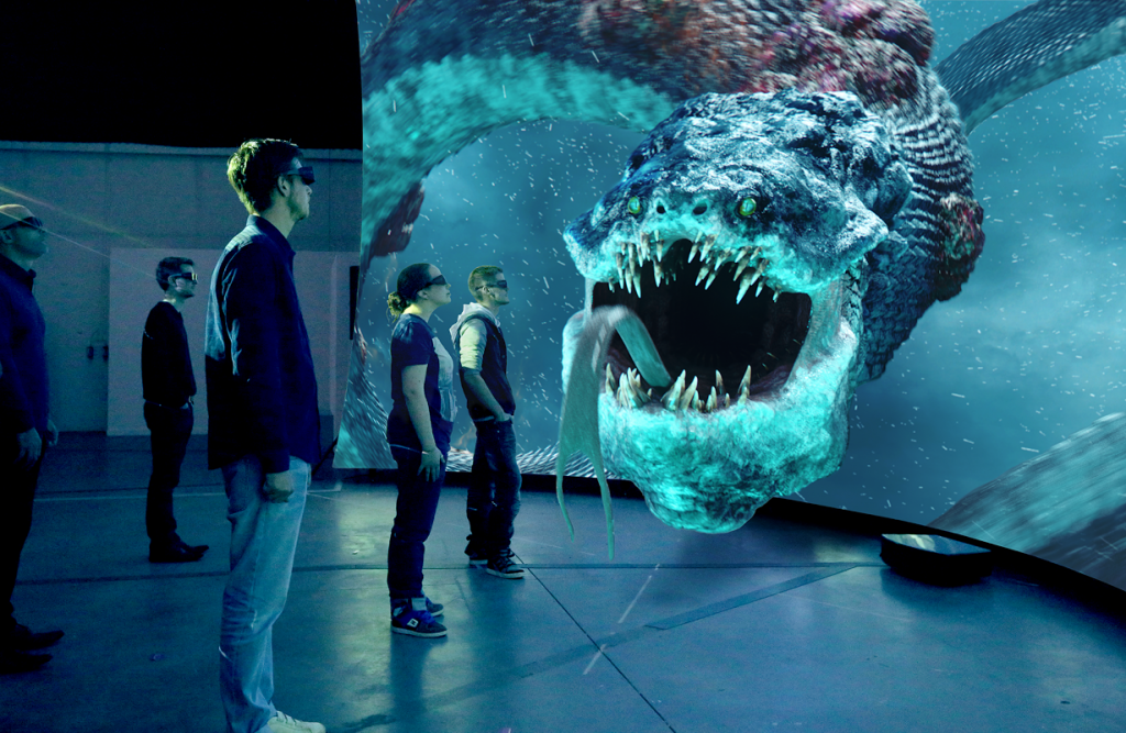 Ce qui est toutefois unique au monde, ce sont les possibilités d’interaction à plusieurs. «Jusqu’à 24 spectateurs peuvent intervenir indépendamment et simultanément sur le déroulement de l’action à l’écran, ajoute Yann Froger. De cette manière, on peut former des équipes, challenger les utilisateurs à l’aide d’un divertissement interactif.» Ces spectateurs sont équipés d’une télécommande dont le repérage dans l’espace est assuré par infrarouge. Pour sauver les dauphins du méchant requin ou détruire les astéroïdes menaçants, ils appuient sur la gâchette.