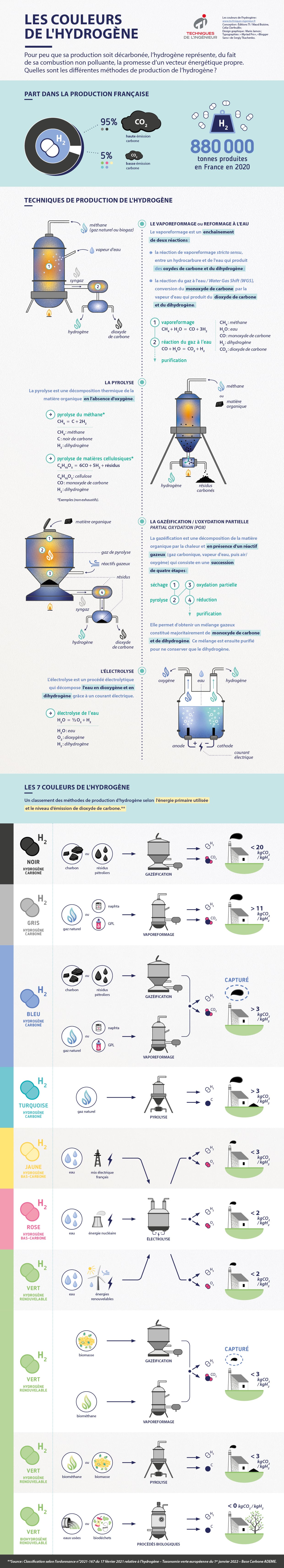 Existant très peu à l’état naturel, l’hydrogène est à ce jour majoritairement produit à partir d’hydrocarbures via des procédés de productions matures comme le vaporeformage du gaz naturel avec l’inconvénient de coproduire du dioxyde de carbone. Les contraintes environnementales conduisent à un basculement vers l’électrolyse à condition que l’électricité utilisée soit décarbonée, ou vers d’autres procédés de production d’hydrogène renouvelable et vert. Les couleurs de l’hydrogène permettent de classer les méthodes de production d’hydrogène en fonction de la quantité de dioxyde de carbone émise.