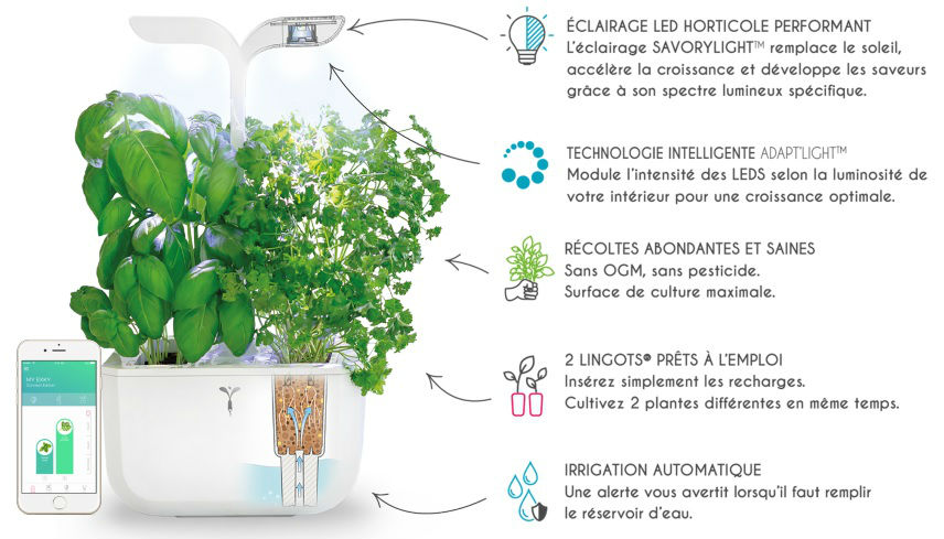 Une fois le lingot placé dans le bac, l’utilisateur n’a plus rien à faire. L’irrigation et le cycle d’éclairage jour/nuit sont gérés en toute autonomie. Il faudra simplement remplir le réservoir d’eau toutes les 4 semaines. Si vous avez peur d’oublier ou que vous souhaitez tout de même recevoir des conseils ou suivre l’évolution de leur récolte, une édition « CONNECT » sera proposée. Elle sera dotée d’une application mobile pour suivre la croissance des plantes, programmer l’éclairage du potager, obtenir des conseils à chaque étape (semis, récolte…) et recevoir des rappels utiles pour l’arrosage ou le remplacement de lingot. Lancement prévu au printemps 2019.