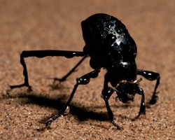 C’est un petit scarabée vivant dans le désert de Namibie qui est à l’origine du concept de cette bouteille. En effet, celui-ci a la capacité de pouvoir condenser à sa surface les particules d’eau existantes dans l’air. Il suffit à l’ingénieux coléoptère de gravir une dune, d’exposer sa carapace face au vent pour récolter jusqu’à 12% de son poids en eau ! Ceci n’a rien de magique. Voilà l’explication. Sa carapace est recouverte de minuscules bosses, au sommet hydrophile. Une fois captée, la gouttelette d’eau se dépose et vient s’ajouter aux autres précédemment captées. Plus fort que le chameau, ce scarabée se promène avec ses propres récupérateurs d’eau sur le dos.