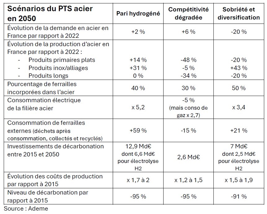 Le troisième scénario de l’Ademe prône « Sobriété et diversification ». Moins de besoins dans le BTP et dans le transport induisent une baisse de 20 % de la consommation d’acier, contenue par une relocalisation de la fabrication d’énergies renouvelables (éolien et photovoltaïque notamment). La production d’acier diminue ainsi globalement de 17 % même si la dynamique est positive (+43 %) pour la filière inox/alliages. Toutes les solutions technologiques sont mobilisées pour décarboner la production : du DRI-H2 ; un haut fourneau avec injection de gaz de cokerie, biocharbon, recirculation des gaz de haut fourneau, et captage et stockage de CO2 ; des EAF alimentés en ferrailles, minerai pré-réduit, et fer issu d’électrolyse. Cette diversification impose 7 Md€ d’investissements.