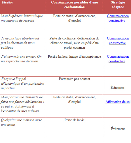 Pour choisir la bonne stratégie, en situation de communication difficile, l’équation à gérer est donc la suivante : « Est-ce que l’enjeu – ou la défense de mon intégrité – est suffisamment important pour que je m’expose aux conséquences d’une confrontation ? ».