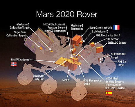 Un Planetary instrument for X-ray lithochemistry (PIXL) lui permettra d’analyser la composition des roches présentes au sol, un Scanning habitable environments with Raman and luminescence for organics and chemicals (SHERLOC) détaillera la minéralogie du site. Le Radar imager for Mars subsurface exploration (RIMFAX) analysera ce qui est caché sous la surface. Le Mars environmental dynamics analyzer (MEDA), bardé de capteurs, servira à mesurer de nombreux paramètres de base comme la température, la pression, l’humidité ou encore la vitesse du vent.