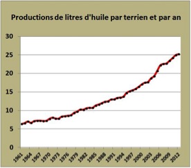 FIG 3 : productions annuelles d’huiles végétales par terrien durant les 50 dernières années (FAO) en litres