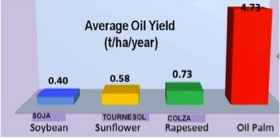 « Proche de quatre tonnes d’huile par hectare (fig.4) (huile de palme + huile de palmiste), le rendement de la palmeraie est, en moyenne mondiale, dix fois supérieur à celui du soja et quatre fois à celui du colza. Les groupes performants atteignent facilement 6 t/ha sur plusieurs milliers d’hectares, et certaines plantations dépassent même 8 t/ha. Ainsi, pour satisfaire une demande en huile croissante, il faut beaucoup moins de surfaces en palmier qu’en toute autre plante oléagineuse. » (Hubert Omont du Cirad, Nov. Déc.2010).
