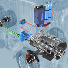 Lors du démarrage, le processus s’inverse complètement : l’huile sous pression se décharge sous le contrôle du bloc de commande et est renvoyée via l’unité à pistons axiaux. Celle-ci devient donc un moteur, entrainé par cette huile sous pression, et transmet sa puissance à la transmission mécanique, réduisant notamment l’émission de particules grâce à une sollicitation moindre du moteur à combustion lors de l’accélération.