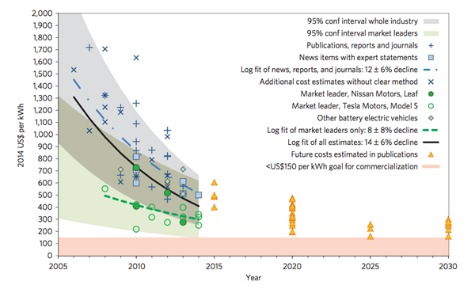 La méta-étude « Rapidly falling costs of battery packs for electric vehicles », dont les auteurs sont les Suèdois Björn Nykvist et Måns Nilsson, est basée sur des estimations de coûts provenant de 80 études peer-reviewed, des estimations d’agences, des rapports d’industries et de cabinets de consultants, des rapports intégrant les analyses de représentants de l’industrie et d’experts, et enfin de manufacturiers leaders du domaine.