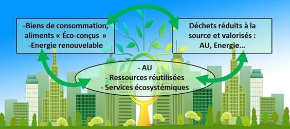 Une des conditions essentielles pour promouvoir la durabilité des villes est l’organisation circulaire et synergique entre les flux de matières et les énergies. Ceci implique au préalable de réduire les flux et d’éco-concevoir les matériaux et produits pour éviter la dispersion de polluants (éco)toxiques. La figure ci-dessous représente par des doubles flèches la circulation et les interactions entre les divers secteurs.
