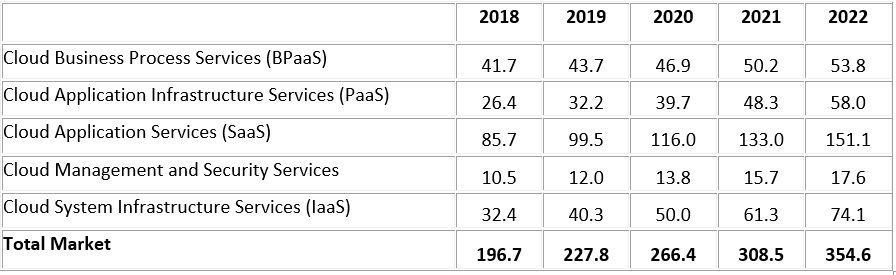 Le marché du cloud public est en pleine expansion. Selon Gartner, le marché mondial des services de cloud s’élève à 227,8 milliards de dollars en 2019. Les logiciels en tant que services (SaaS) restent le segment de marché le plus important.