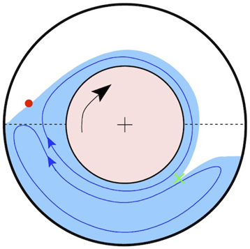 Schéma de la vue transversale de l’écoulement d’un fluide entre deux cylindres concentriques. Le point rouge représente un point de stagnation et la croix verte indique la position d’une pointe