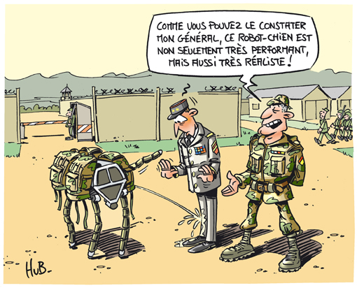 A l'occasion de chaque cahier thématique, Hubert Blatz, dessinateur, revient avec humour et malice sur les problématiques abordées par la rédaction. Ce mois-ci, nous nous intéressons à l'innovation dans le secteur de l'armée et de la Défense en général...