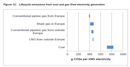 Selon un rapport publié le 23 août 2012 par le Département à l’Energie Américain (US DoE), « le parc actuel des centrales à gaz fonctionnant en base émet 514 grammes de CO2 par kWh sur l’ensemble du cycle de vie. Le remplacement du gaz naturel conventionnel par du gaz non conventionnel conduit à un niveau d’émission de 520 grammes de CO2 par kWh, c’est à dire une hausse de seulement 1%.» Le rapport de la Commission européenne rendu public en septembre 2012 parvient à des conclusions similaires : l’impact climatique du gaz de schiste par unité d’électricité en sortie de centrale (450 g/kWh) est très inférieur à celui du charbon (environ 760 g/kWh) et équivalent à celui du gaz naturel conventionnel non européen d’importation, provenant notamment de Russie. « Les émissions de l’électricité provenant du gaz de schiste sont significativement plus faibles (entre 41 et 49%) que l’électricité provenant du charbon. »