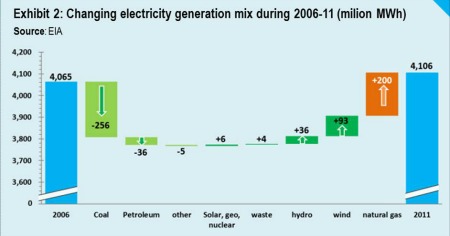 Selon l’US Energy Information Administration (EIA), la production électrique aux USA est passée de 4065 TWh en 2006 à 4106 TWh en 2011. Sur cette période 2006-2011, la production des centrales à charbon a chuté de 256 TWh et celle des centrales au fioul de 36 TWh. Parallèlement, la production des centrales au gaz naturel a au contraire augmenté de 200 TWh, celle de l’éolien terrestre de 93 TWh, celle de l’hydroélectricité de 36 TWh et celle des déchets de 4 TWh. La variation globale de toutes les autres filières réunies (solaire, géothermie, nucléaire et autres) est marginale (+ 1 TWh). La progression du gaz naturel et de l’éolien terrestre a ainsi joué un rôle majeur dans le recul du charbon et du fioul.