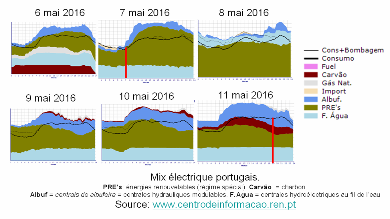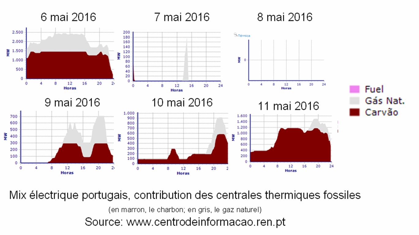 Le 7 mai la production thermique a été quasi-nulle. Le 8 mai complètement nulle. Donc oui, pendant une journée entière le Portugal a fonctionné sans brûler aucun combustible fossile, et uniquement avec les EnR. Mais pas 4 jours. Le 9 mai la production thermique a été de 5,6 GWh (3,4%). Idem le 10 mai avec 5,6 GWh (3,0%). Et le 11 mai, 22,2 GWh (12,4%).