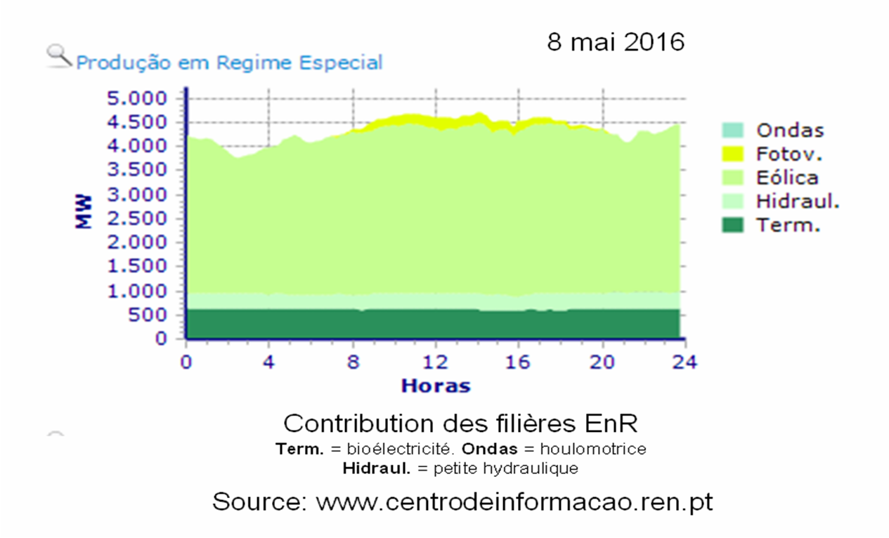 Début 2016 le pays du Fado comptait une puissance installée de 6024 MW d’hydraulique (dont 5360 MW de grands barrages), 5033 MW d’éolien, 566 MW de centrale bioélectriques, 474 MW de solaire PV, et 29 MW de centrales géothermiques. De nouveaux records seront vraisemblablement battus cette année.