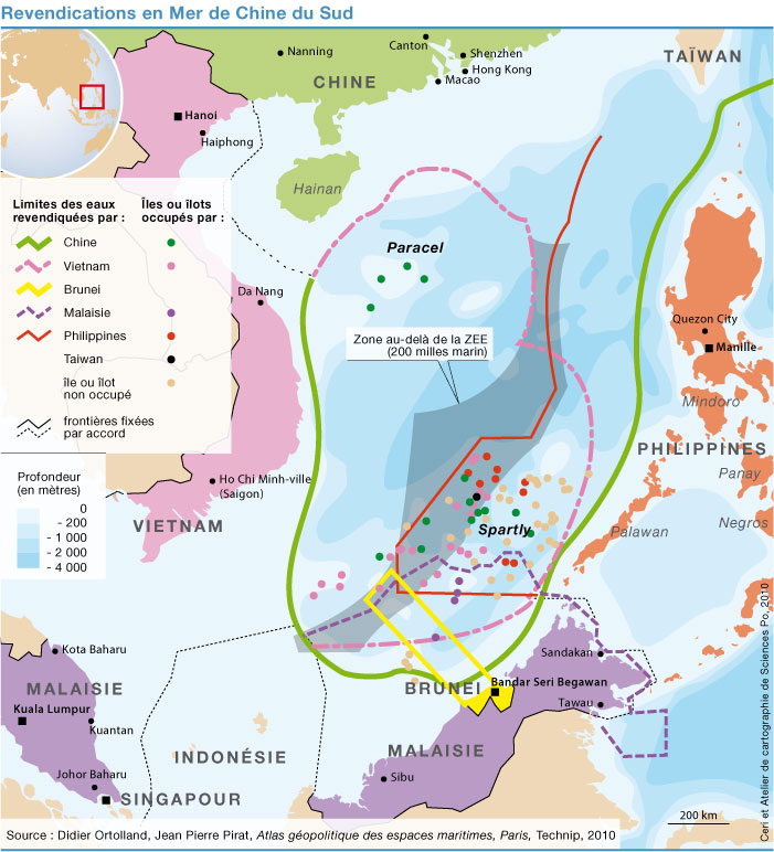 Les îles Spratley et Paracels (voir carte), sur lesquelles du pétrole a été découvert au début des années 1990, sont au cœur des tensions régionales. Le Vietnam et la Chine s’en disputent la souveraineté, ainsi que la Malaisie, Bruneï, Singapour et l’Indonésie…
