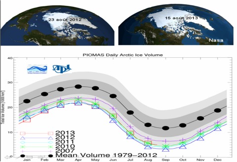 Selon les données PIOMAS (Pan-Arctic Ice Ocean Modeling and Assimilation System), le volume de la banquise arctique en août 2013 (5800 km3 , 1 km3 = 1 milliard de mètres-cubes) est supérieur de 1400 km3 (+31%) à celui de 2012 (4400 km3). Il est également supérieur de 700 km3 à celui de 2011 (5100 km3) et supérieur de 200 km3 à celui de 2010 (5600 km3). Et l’écart est en train de se creuser davantage en ce premier tiers de septembre, c’est à dire à quelques jours du point minimal de l’année, selon le Polar Science Center (PSC) basé au sein de l’Université de Washington aux Etats-Unis. La banquise arctique se porte donc mieux cet été que les trois dernières années.