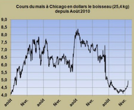 A quatre dollars le boisseau (16 US cents le kg) en Août 2010 les cours du maïs après des rumeurs de mauvaises récoltes et des accroissements de surfaces cultivées aux Etats-Unis se sont parfois emballés puis sont revenus vers ces niveaux initiaux en cette fin d’hiver 2013-2014, quoique dernièrement stimulés, semble-t-il, par les péripéties ukrainiennes.