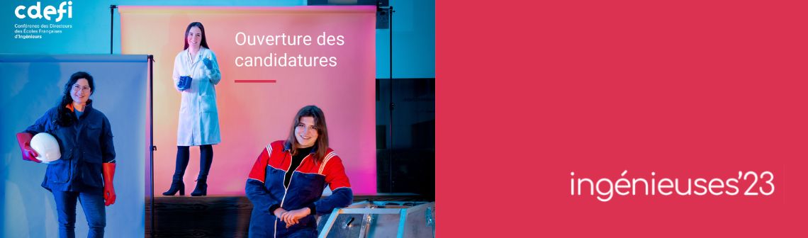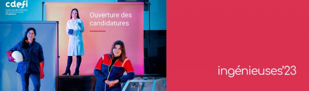 Vous avez un projet ou réalisez des actions dans le but, entre autres, de favoriser l'orientation des jeunes filles vers les filières scientifiques et techniques! Alors n’hésitez plus et déposez votre candidature pour le concours Ingénieuses’23 de la CDEFI (Conférence des directeurs des écoles françaises d’ingénieurs). Clôture des candidatures le 8 mars 2023.
