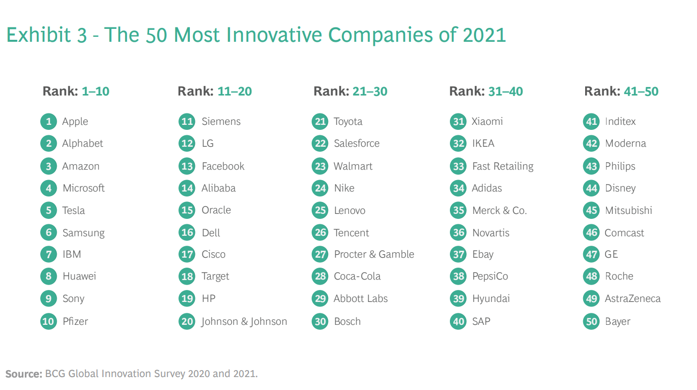 Apple, Alphabet, Amazon, Microsoft et Tesla sont considérées comme les cinq entreprises les plus innovantes, selon l'analyse du BCG sur les 50 entreprises les plus innovantes de 2021.