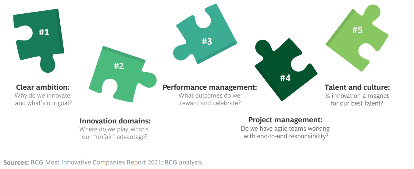 Il n’y a pas un secteur plus favorable qu’un autre à l’innovation. Mais le BCG pointe cinq facteurs qui différencient le plus les entreprises innovantes et celles qui sont à la traîne. Les cinq facteurs qui indiquent le mieux le potentiel d’innovation d’une entreprise sont les suivants :