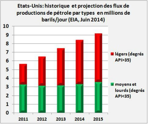 Cependant, affirme l’EIA, compte tenu de la part des condensats de gaz de schistes dans les productions de pétroles américains, c’est la part des pétroles légers qui s’accroit, alors que les productions de pétroles lourds ou moyens restent sensiblement constantes (FIigure 1).