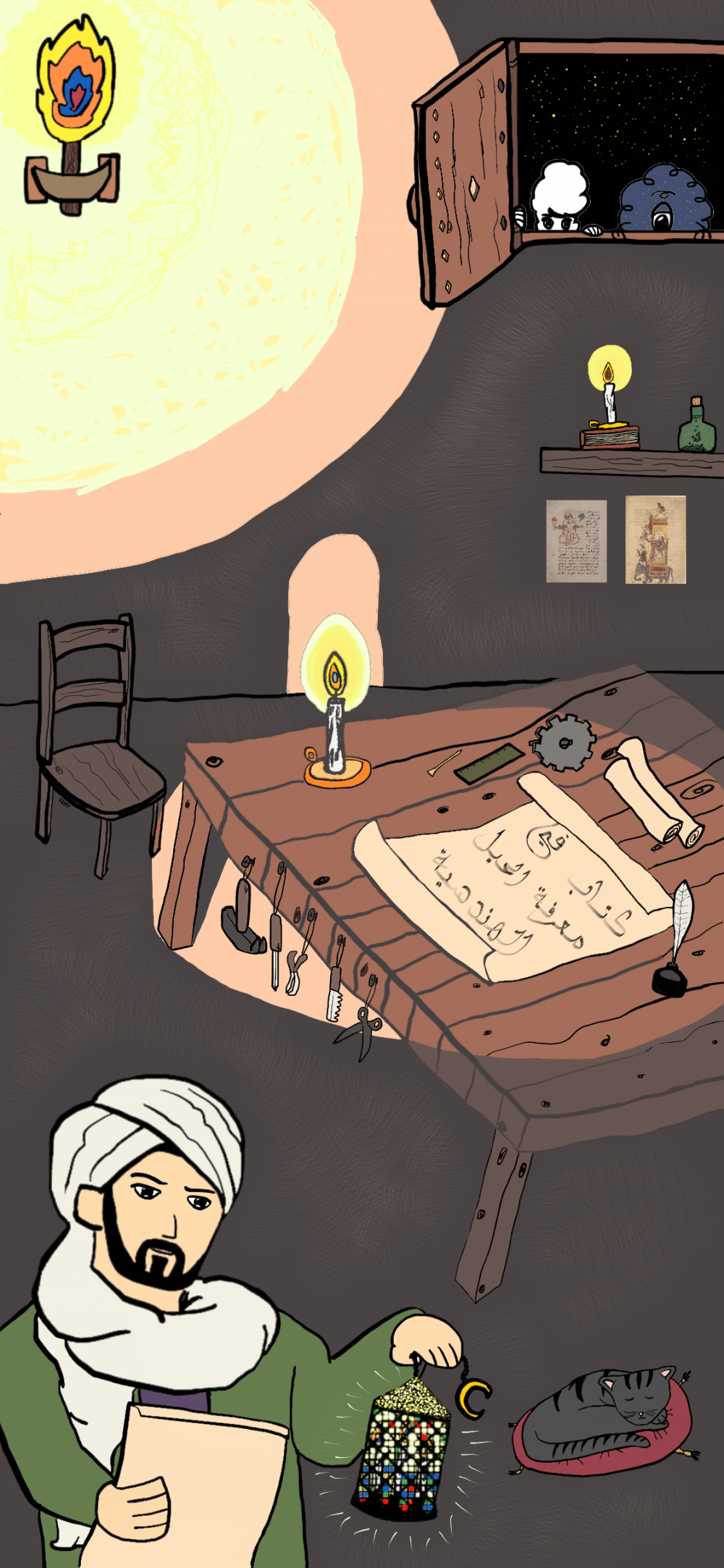 Accrochés au mur du fond, sont deux dessins de prototypes d’automates faits de la main d’Al-Jazari. Zoomons donc. Examinons-les de plus près. Les choses sérieuses peuvent commencer.