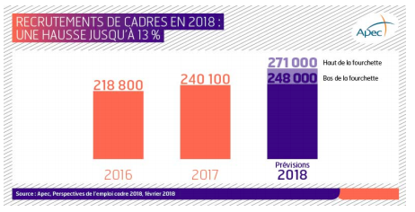 À partir des réponses de 11 000 entreprises interrogées entre les mois d’octobre et décembre 2017, l’Apec estime que les recrutements de cadres pourraient être compris entre 248 000 à 271 000 en 2018. Cette évolution correspondrait à une augmentation de 3 % à 13 % par rapport à 2017. La médiane des recrutements se situerait à 259 500. Dans un contexte où les indicateurs économiques sont au vert, ces résultats reflètent une confiance solide de la part des recruteurs en la pérennité de la croissance. Au moment de l’enquête, trois fois plus d’entreprises ont déclaré avoir l’intention d’accroître leur effectif cadre que de le réduire, respectivement 12 % contre 4 %. Une configuration inédite depuis 2007.