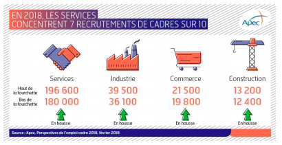 L’analyse par secteur révèle sans surprise que les Services pourraient totaliser jusqu’à 196 600 embauches de cadres sur l’ensemble de l’année. Dans le même temps, le Commerce, la Construction et l’Industrie devraient être boostés par la bonne santé économique et accroître sensiblement leurs recrutements de cadres. Respectivement jusqu’à +9 % et +12 %.