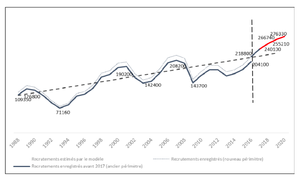 En 2018, le nombre de recrutements de cadres augmenterait de plus de 6 % et se situerait au-dessus du seuil des 250 000. Cette prévision se situe légèrement en deçà de la médiane des prévisions des entreprises à fin 2017 (259 500). Si le maintien de ce niveau de croissance se confirmait, le volume de recrutements de cadres atteindrait en 2019 et 2020 des niveaux inégalés.