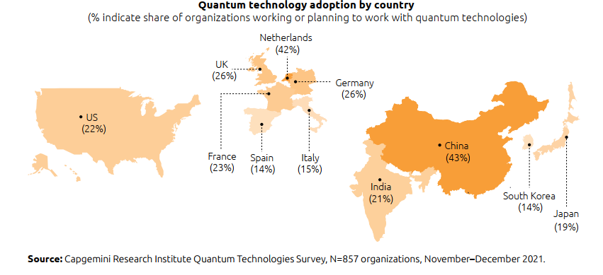 Comme le montre le graphique ci-dessous, la France n’a pas à rougir puisqu’un quart environ des entreprises hexagonales interrogées par Capgemini s’appuie (ou prévoit de le faire) sur des technologies quantiques. Mais les Pays-Bas et la Chine se montrent très en avance sur le sujet avec près de 40 % d’organisations ayant intégré le quantique dans leurs projets.