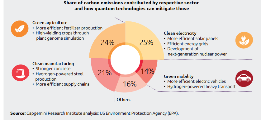 La figure ci-dessus montre quatre domaines clés dans lesquels les technologies quantiques peuvent contribuer à améliorer la durabilité environnementale. Par exemple, la production d’électricité représente 25 % des émissions de gaz à effet de serre selon une étude publiée en février 2022 par l’US Environment Protection Agency (EPA).