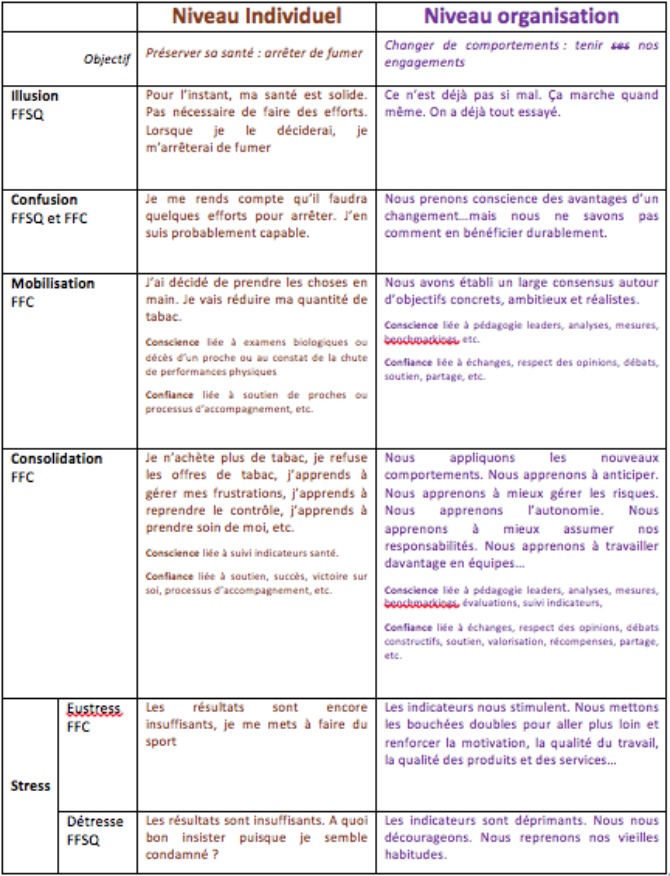 Au niveau des organisations, la gestion sage et astucieuse des angoisses d’apprentissage et de survie décrites ci-dessus favorise le processus de mobilisation au changement.
