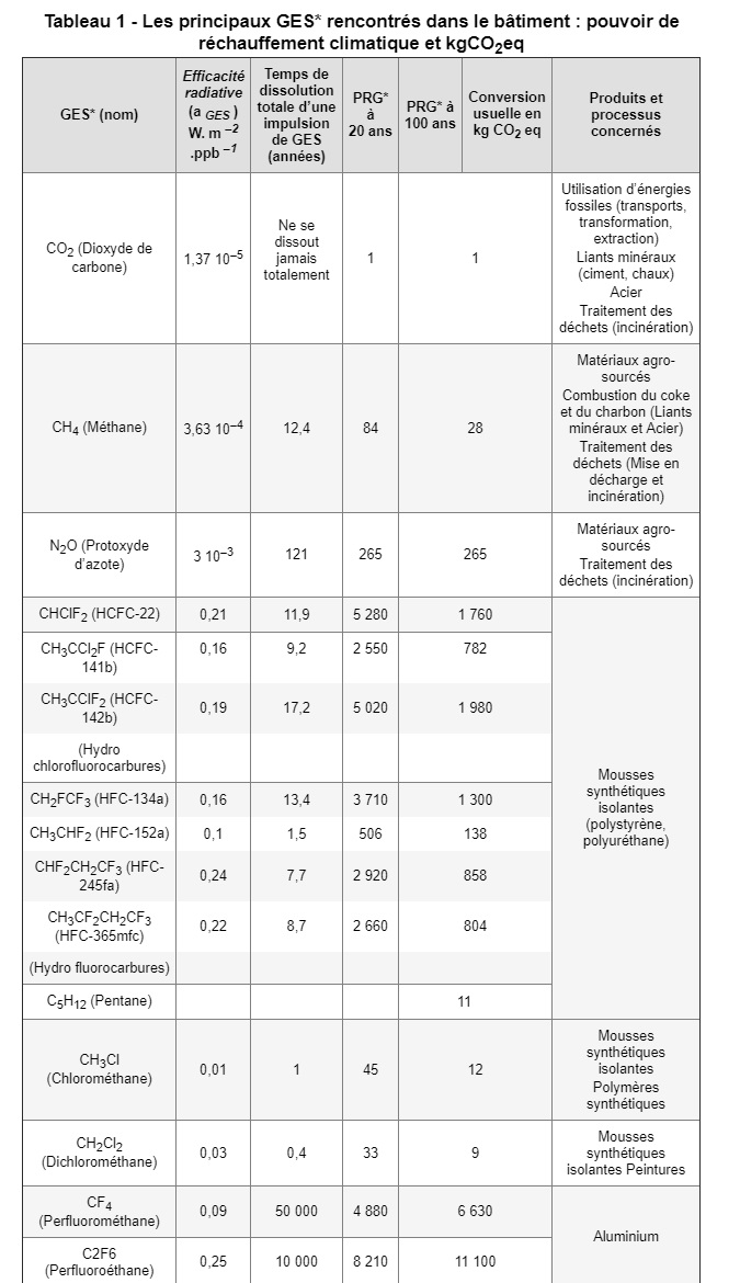 Les principaux gaz à effet de serre émis dans le milieu de la construction dépendent du type de matériau et des procédés utilisés. Le Tableau 1 reprend les données de Berje et du GIEC, et propose un inventaire des principaux gaz à effet de serre émis dans le cycle de vie des matériaux du BTP.
