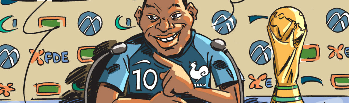Chaque mois, le dessinateur Hubert Blatz croque l'actualité... Ce mois-ci, après la victoire de l'équipe de France de football, Kylian Mbappe révèle les secrets de sa technique au monde entier...