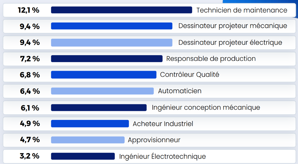 Les automaticiens, ingénieurs en conception mécanique, acheteurs industriels, approvisionneurs et ingénieurs électrotechniques figurent également dans ce top 10.