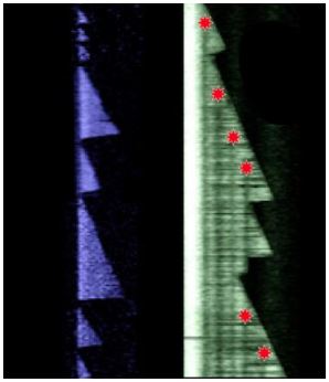 La dynamique des microtubules (assemblage et désassemblage de tubuline ) peut être représentée à l’aide de kymographes construits par empilement d’images montrant la longueur de microtubules en fonction du temps. Les kymographes des images ci-dessous montrent à gauche, en bleu, des microtubules in vitro sans aucune intervention externe ; à droite, en vert, des microtubules qui ont été la cible d’impacts laser (étoiles rouges).