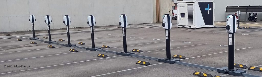 Le cas d’usage typique est la station de recharge pour véhicules électriques. Pour faire simple, plutôt que d’avoir à raccorder 10 ou 20 bornes de recharge sur leurs armoires électriques, les entreprises ont simplement à raccorder le conteneur d’où part une sorte de « multiprise » haute performance qui s’installe sur le parking, sans travaux de génie civil complexes.