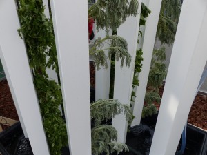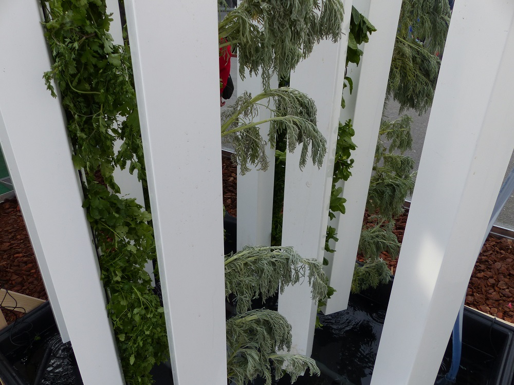 Le système fonctionne en boucle fermée. Dans le bassin, l’eau se charge en nutriments grâce aux déjections des poissons. Cette eau est filtrée, pompée et injectée au goutte à goutte dans les tours verticales où elle irrigue les racines des végétaux. Le substrat en polyéthylène téréphtalate (PET) alimentaire contient l’écosystème bactérien nécessaire à la transformation de l’ammoniac. Le système nécessite entre 1 000 et 1 200 litres d’eau par an.