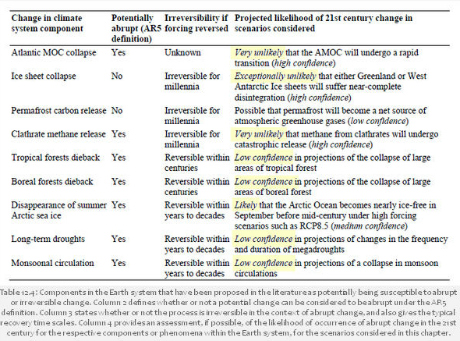 « Ce tableau [du rapport scientifique du GIEC, ndlr] devrait vous permettre d’apaiser les angoisses des nombreux alarmistes du pergélisol, des clathrates, de l’arrêt du Gulf-Stream, du dépérissement des forêts, des sécheresses à répétition, des moussons interrompues etc. qui s’expriment fréquemment dans les médias et sur la toile » estime Jacques Duran, ancien Vice-Président, Chargé de la Recherche, de l’Université Pierre et Marie Curie, qui, à présent à la retraite, est devenu spécialiste en correction des propos tenus par les exagérateurs climatiques.