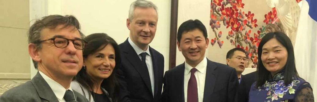 De gauche à droite Philippe Stéfanini, directeur général de Provence Promotion, Christine Cabau Woehrel, présidente du directoire du Grand Port Maritime de Marseille, Bruno Le Maire, ministre français de l’Economie et des Finances et Que Weidong, fondateur et président directeur général de Quechen Silicon Chemical avec son épouse.