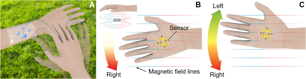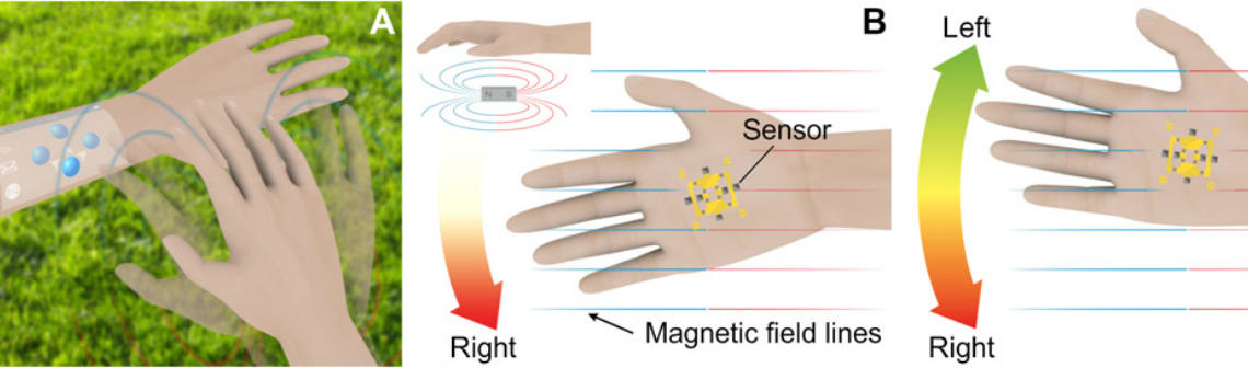 Dans la première expérience, un aimant permanent est fixé au bout du doigt d’une personne. Sur son autre main, un serre-poignet élastique contient le dispositif des chercheurs muni d’un capteur 2D. Quand le bout du doigt s’approche du serre-poignet le capteur peut déterminer l’angle d’approche, cet angle est converti en un caractère prédéfini (un chiffre par exemple). Les différentes positions du doigt procurent donc différents caractères et peuvent être transformer en un clavier activable à distance.