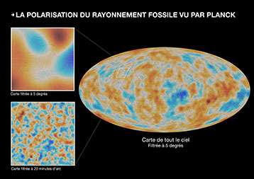 Sur la carte ci-dessus, les couleurs indiquent les écarts de la température du rayonnement fossile par rapport à sa valeur moyenne. Les zones bleues, plus froides, et les zones rouges, plus chaudes, témoignent des variations dans la densité de la matière tôt dans l’histoire de l’Univers. La direction et l’intensité de la polarisation apparaissent en filigrane sur la carte de température. Elles forment une empreinte qui témoigne des mouvements de matière qui chute vers les régions les plus denses et fuit les régions moins denses. Ces structures s’observent à différentes échelles sur le ciel.