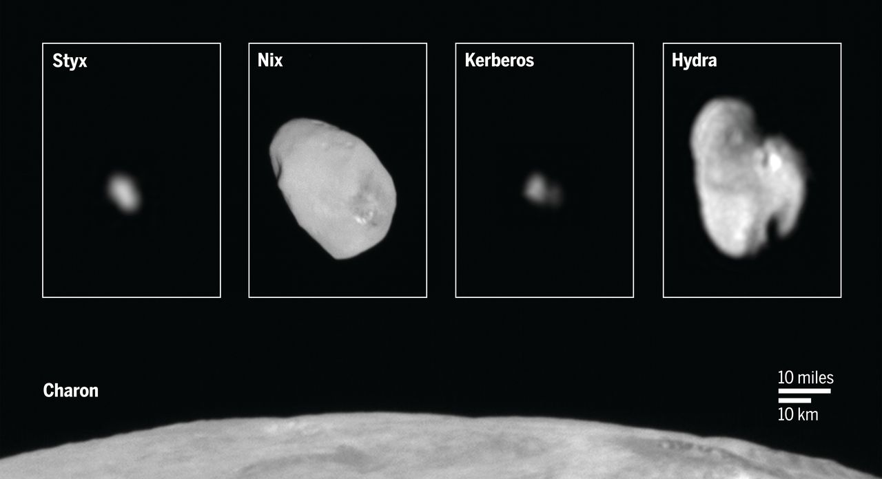 Ce n’est que depuis 2012 que nous savons que Pluton possède 5 satellites, le dernier découvert étant Styx. Grâce à New Horizon, une meilleure caractérisation de l’ensemble du système et de ces satellites a été possible. Autour du système binaire formé par Charon et Pluton, gravitent donc, sur des orbites à peu près circulaires quatre petites lunes (Nyx, Hydra, Styx et Kerberos) qui sont de formes plutôt allongées et dont le diamètre (équivalent sphérique) est de l’ordre de 40 km pour les deux premières et 10 km pour les deux secondes. Toutes quatre ont un albedo élevé (50-90%) suggérant la présence de glace d’eau à leur surface. La densité des cratères d’impact suggèrent un âge de l’ordre de 4,5 milliards d’années. L’orientation de leurs pôles, le fait qu’elles soient non synchronisés laisse à penser qu’elles ont été formées juste après la collision qui a créé le couple Charon-Pluton. Les données concernant la composition chimique de ces lunes ne sont pas encore parvenue à la Terre.
