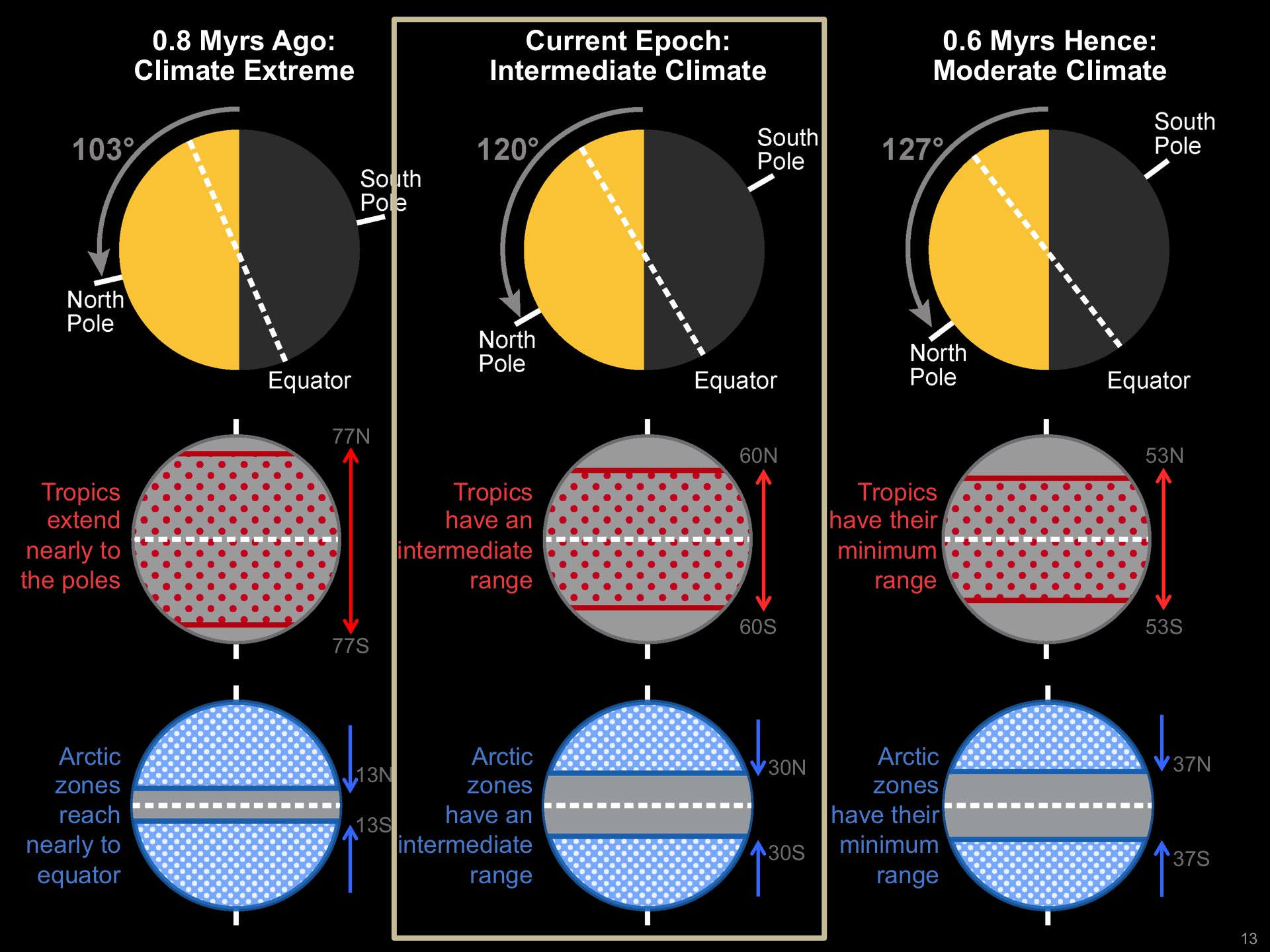Comme la Terre, Pluton a un axe de rotation incliné par rapport à son orbite. Il y existe donc des saisons. Très longues puisque Pluton fait le tour du Soleil en 247,7 ans. Mais l’inclinaison est bien plus importante que sur notre planète (120° actuellement contre 23° chez nous). Si bien que la zone tropicale peut être aussi une zone arctique selon les saisons. En outre, l’axe de rotation de Pluton varie beaucoup, pas seulement de 1° comme sur Terre mais de près de 25°, passant de 13 à 127° en quelques millions d’années. Un changement qui bouleverse le climat périodiquement en influant par exemple sur les propriétés de l’atmosphère comme la pression atmosphérique. Aujourd’hui mesurée à 10 microbars, elle a certainement atteint 1000 à 10 000 fois plus. Ce qui implique, avec une température moyenne de l’ordre de 40°K (-223°C) : l’existence possible d’un cycle de l’azote avec de l’azote liquide qui s’écoulerait à sa surface. Ce qui expliquerait un certain nombre de formes géologiques révélées par New Horizon.